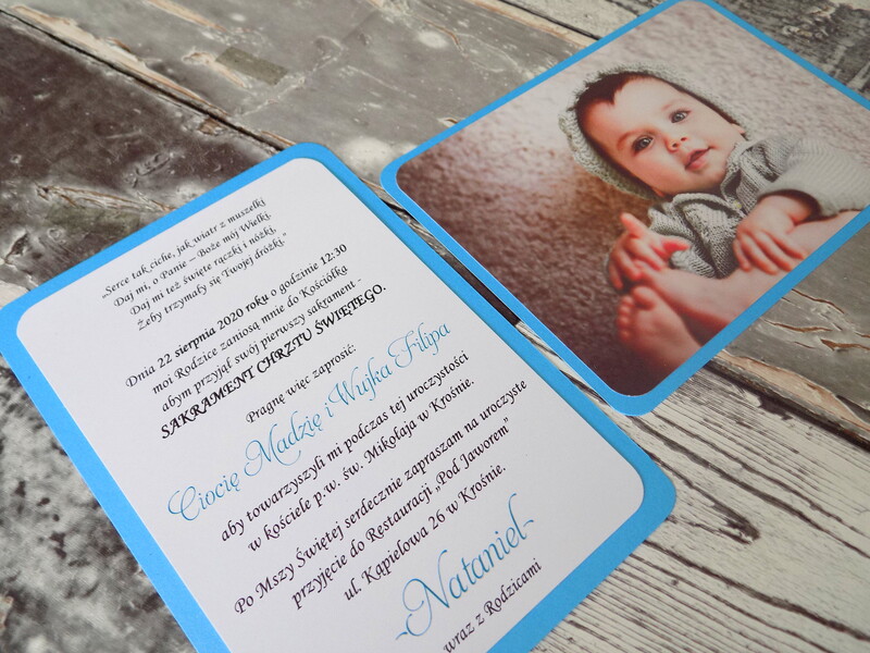 Zaproszenie składa się z dwóch wkładek, spiętych wstążeczką. Jedna z nich zawiera zdjęcie pociechy, druga - tekst zaproszenia.