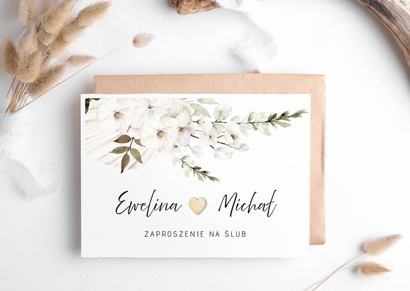 AW-ZDS1Zaproszenia/zawiadomienia ślubne z motywem białych kwiatów i drewnianego serduszka. Grafika - akwarela, wysokiej jakości wydruk.