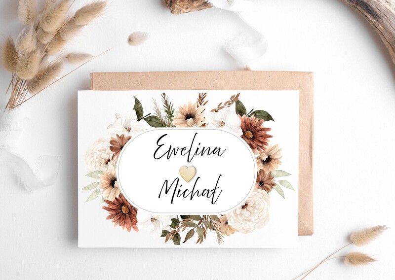 AW-ZDS3Zaproszenia/zawiadomienia ślubne z motywem pięknych jesiennych kwiatów, traw oraz drewnianego serduszka. Grafika - akwarela, wysokiej jakości wydruk - jesienna kolorystyka.