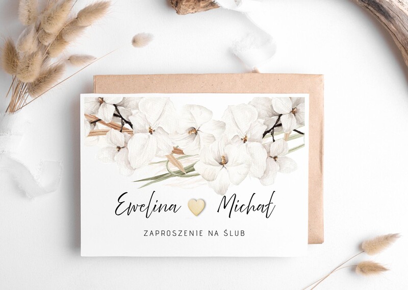 AW-ZDS7Zaproszenia/zawiadomienia ślubne z motywem pięknych, delikatnych kwiatów oraz drewnianego serduszka. Grafika - akwarela, wysokiej jakości wydruk.
