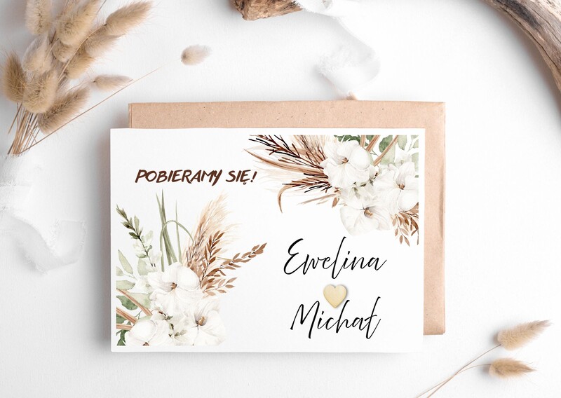 AW-ZDS8Zaproszenia/zawiadomienia ślubne z motywem pięknych, delikatnych kwiatów, traw oraz drewnianego serduszka. Grafika - akwarela, wysokiej jakości wydruk.