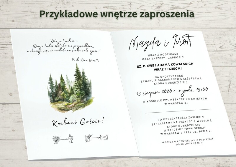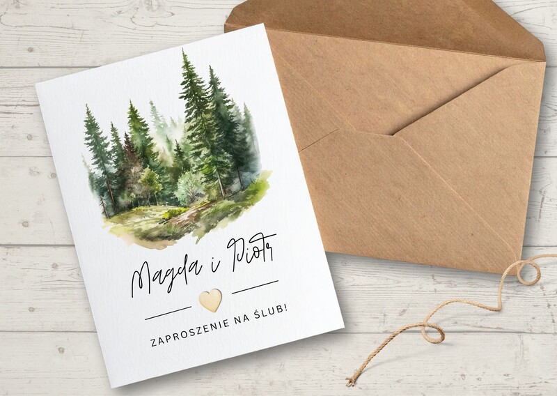 AW-AL3Zaproszenia/zawiadomienia ślubne z motywem akwarelowego lasu. Wysokiej jakości wydruk, piękne kolory.